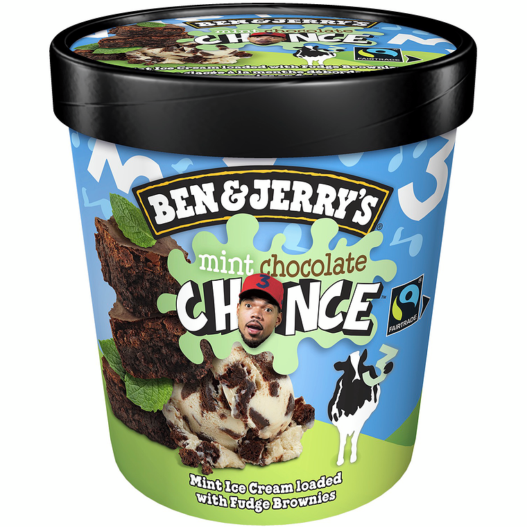 Ben & Jerry's Ice Cream Mint Chocolate Chance features mint ice cream loaded with fudge brownies for a delicious frozen treat designed by our FlavourGurusInspired by Chance the Rapper's love of mint ice cream, chock full of homemade brownies, we present his debut flavour in Mint Chocolate Chance. Enjoy!Ben & Jerry's ice cream sources Fairtrade Certified bananas, coffee, cocoa, sugar, & vanillaBen & Jerry's ice cream uses Canadian dairy certified by Dairy Farmers of CanadaBen & Jerry's ice cream is Certified KosherBen & Jerry's ice cream is made with non-GMO ingredients & cage-free eggs