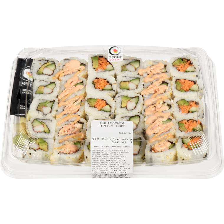 The classic California Roll, stuffed with savoury crab mix, avocado and cucumber. Topped with sesame.Allergen Alert : We cannot guarantee that any items have not come into contact with Peanuts, Tree nuts, Milk, Fish, Crustacean, Shellfish, Egg, Soy, Sesame, Wheat Mustard, Sulphites.