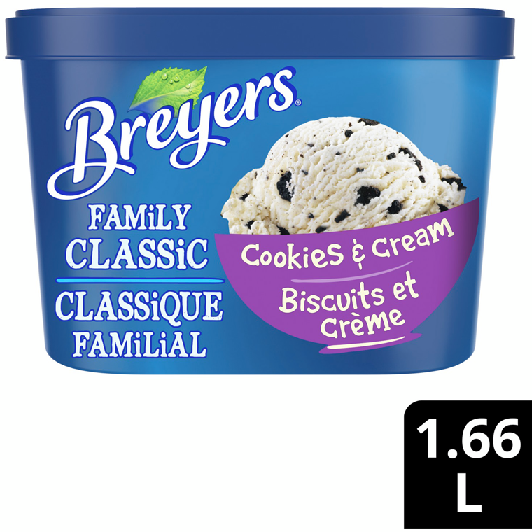 Breyers Family Classic Cookies & Cream Frozen Dessert is made in Canada with domestic and imported ingredientsThe perfect complement to your favourite dessert, and a great treat all by itself, it is part of our Family Classics rangeLike all Breyers, cookies & cream frozen dessert is made with Canadian Dairy certified by Canadian Dairy Farmers of CanadaYour favourite cookies & cream made with scrumptious chocolate sandwich cookies with sweet creamy filling folded inside our classic vanilla.This delicious Breyers frozen dessert is also kosher certifiedBreyers has over 150 years of experience making delicious ice cream and frozen dairy desserts