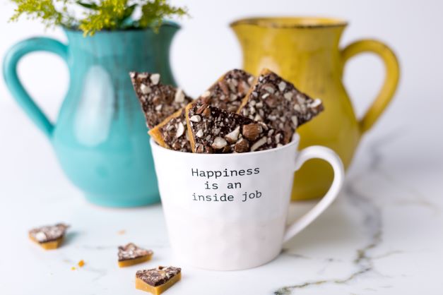 The ultimate pick me up! Dark roasted espresso blends make this the most delectable brittle you have ever savored. Then we pour chocolate on and top it with crushed almonds. High test flavor and espresso here!