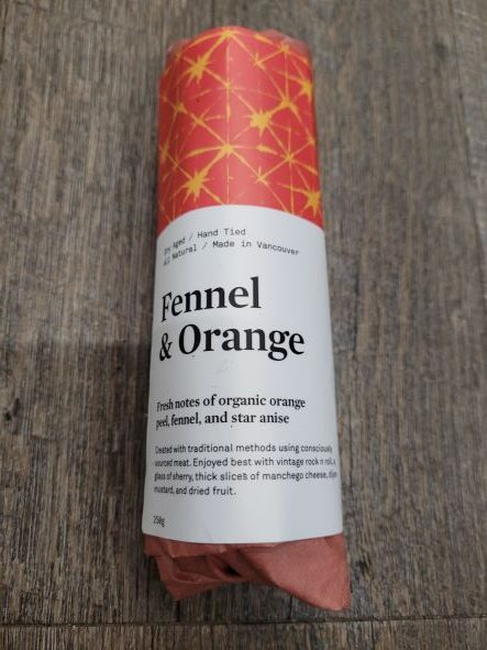 Ingredients: pork, red wine [may contain sulphites], Himalayan salt, organic orange peel glucose, black pepper, garlic, fennel, star anise, sodium nitrate