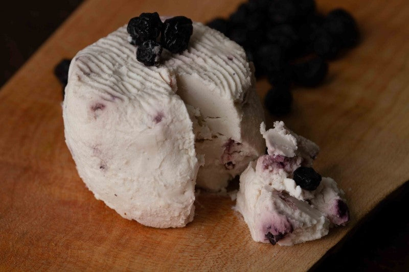 Le Bleuet Cumulus: one of our 4 cumulus style cheeses. Coconut milk, cultures, blueberries, salt. Washed with a ginger beer fermented blueberry wash. Tangy, fresh, earthy/sweet, a great cheese for charcuterie, on bagels/toast, or even to make a vegan dessert with.