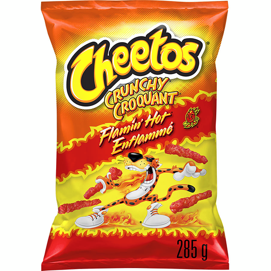 The crunchy cheesy taste you love with a Flamin’ Hot kick! Caution! The contents of this bag have been found to be Dangerously Cheesy and deliciously spicy! One crunch of Cheetos Crunchy Flamin’ Hot cheese flavoured snacks may lead to the following cheese-crazed behaviour: 1. A joy for all things cheesy! 2. Never-ending thoughts of the tongue-tingling taste you love!These beloved cheese flavoured snacks are always a hit. Admit it, you can’t help but eat Cheetos without licking the signature “CHEETLE” off your fingertips.These melt-in-your mouth crunchy cheese flavoured snacks have been a go-to snack for many years. The dangerously cheesy taste of these cheese flavoured snacks is guaranteed to amp up the fun.Turn up the heat and kick up the intensity of your snacking with Cheetos Crunchy Flamin’ Hot cheese flavoured snacks – these spicy snacks will satisfy your need for heat.DANGEROUSLY CHEESY TASTE — The crunchy cheesy taste you love with a Flamin’ Hot kick!SATISFYINGLY CRUNCHY – A snack that is so deliciously crunchy, every bite is sure to hit the spot.TURN UP THE HEAT – Kick up the intensity of your snacking with Cheetos Crunchy Flamin’ Hot cheese flavoured snacks – these spicy snacks will satisfy your need for heat.A GO-TO SNACK – They’re guaranteed to amp up the fun.LOVED BY FAMILIES FOR YEARS — And you’re never too old to get a little cheesy with Cheetos.