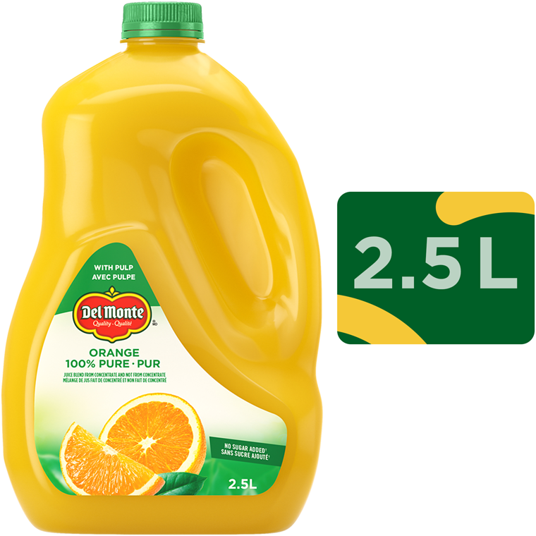 Del Monte Orange Juice with Pulp delivers a classic taste of sunshine in every satisfying sip. This orange juice with pulp gives you the timeless flavour and texture of freshly squeezed orange juice. It’s loaded with vitamin C and is a source of potassium, magnesium and folate. Bursting with bold orange flavour, this Del Monte Orange Juice is a fresh way to brighten up any day.Keep refrigerated for up to 10 days after opening; serve chilled and shake well before using.Orange juice with pulpNo sugar addedVitamin C addedGood source of potassiumSource of magnesium and folate2.5 L