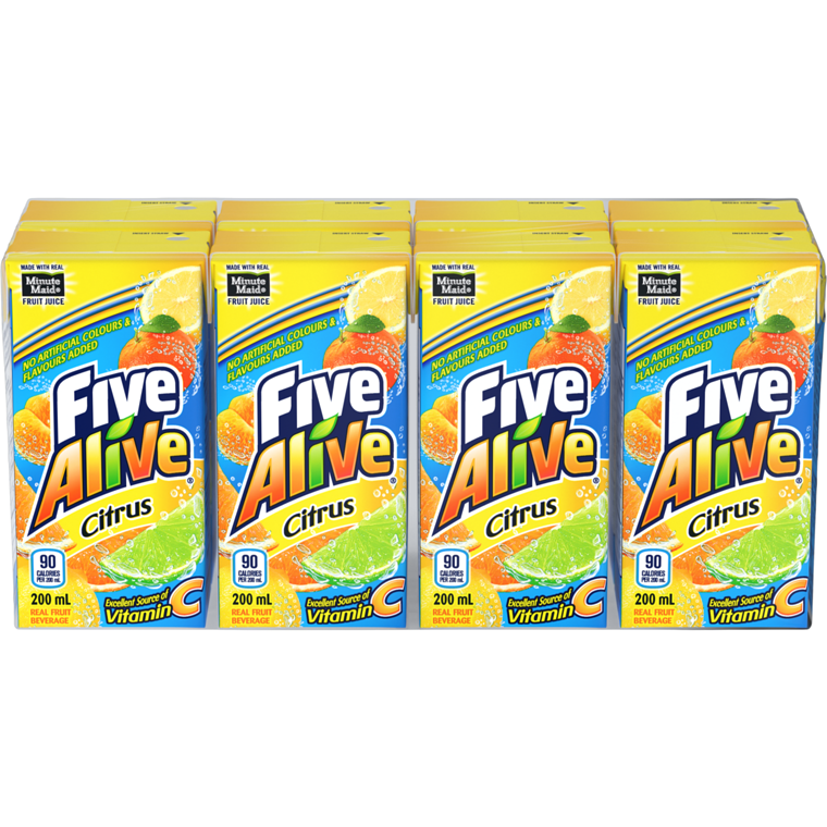 No boring juice here. This delicious blend of lemon, lime, orange, grapefruit and tangerine is made from real fruit, is an excellent source of Vitamin C and available in convenient juice boxes. Feel alive with the citrus zing of Five Alive fruit juice, made from concentrateEnjoy the juicy taste of orange, lemon, lime, grapefruit and tangerineEach 250 mL serving satisfies 100% of your daily Vitamin CThe five fruit refresher, made with 5 fruit flavoursAvailable in a 200 mL bottle