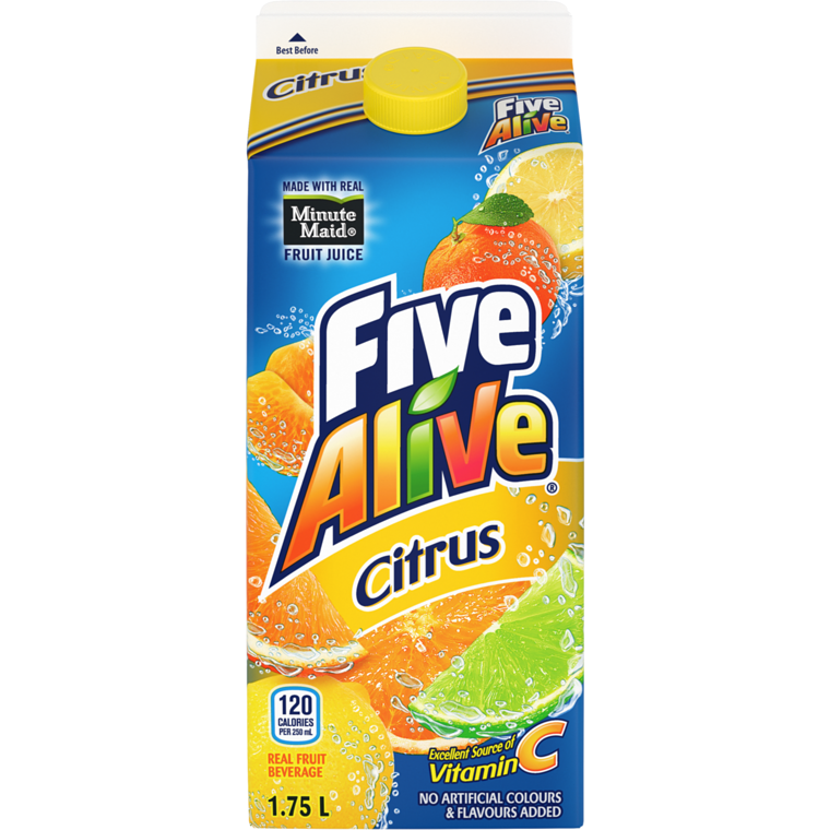 This isn't your boring status-quo juice. A delicious blend of five fruit flavours, including lemon, lime, orange, grapefruit and tangerine, it delivers a taste explosion with a unique citrus zing. Feel alive with the citrus zing of Five Alive fruit juice, made from concentrateEnjoy the juicy taste of orange, lemon, lime, grapefruit and tangerineEach 250 mL serving satisfies 100% of your daily Vitamin CThe five fruit refresher, made with 5 fruit flavoursAvailable in a 1.75 L bottle