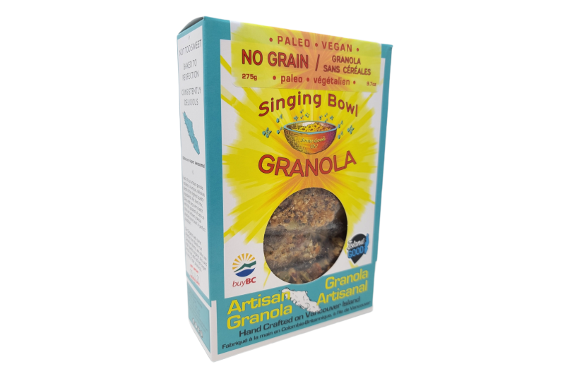 Singing Bowl NO GRAIN Granola is a perfect blend of nuts, seeds, coconut, coconut oil and maple syrup, and that’s all! Clean ingredients, no fillers, and not too sweet. These delicious, melt-in-your-mouth grain-free, protein-packed granola clusters are perfect for a paleo snack, or mixed with plant-based milk for a delicious, vegan breakfast.