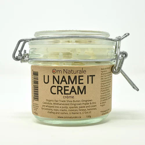 Organic Fair Trade Shea Butter, Zinc Oxide (15%), Omgrown Calendula & Omgrown Wildcrafted Poplar infused Organic Olive & Organic Sunflower Oil, Vitamin E, Jojoba oil, Essential oils of: Vanilla, Lavender & Chamomile