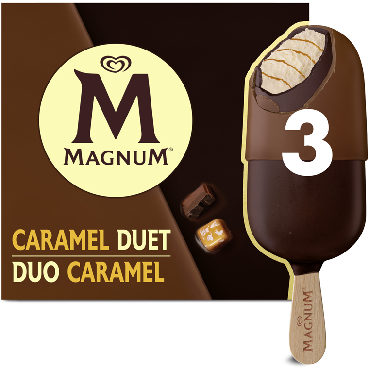 Magnum Duet Ice Cream Bar Caramel features our new double-dipped technology for a most decadent and delightful chocolate treatThese Magnum Duet Ice Cream bars are fully dipped in rich dark chocolate, then finished with a delicate half dip in luscious milk chocolate, and made with unsweetened Belgian chocolate.Crack into this Magnum Ice Cream Bar with two kinds of decadent chocolate for the ultimate duet of dessert indulgenceMagnum Chocolate Ice Cream bars are made in Canada with 100% Canadian milk and Belgian chocolate derived from Rainforest Alliance Certified CocoaMagnum Caramel Duet combines milk and dark chocolate pleasure with velvety caramel ice cream with a silky sea salt caramel swirlThis pack of Magnum Duet Caramel Ice Cream Bars contains 3 ice cream bars