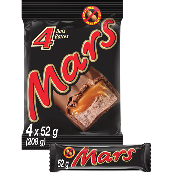 Treat yourself to a delicious, delightful experience with MARS. Caramel and nougat collide in this Canadian classic. These distractingly delicious, individually wrapped full size bars are great for sharing with coworkers and friends, gifting or enjoying all by yourself. With a pack of 4 full size bars, there's no wrong way to enjoy MARS Bars. Always peanut-free, always delicious. Eating a MARS bar provides a true time out where all you can focus on is enjoying the thick chewy caramel and nougat, wrapped in a delicious chocolately coating.Pack contains four (4) Full Size MARS Caramel Candy BarsCaramel and nougat coated in a delicious chocolately layer.Stock your pantry with individually wrapped, Full Size MARS Caramel Chocolate Candy Bars to share with friends and familySingle Size MARS Peanut Free Chocolate Candy Bars are great for keeping in your desk to brighten your afternoonMARS Caramel Candy Bars are a distractingly good afternoon treat