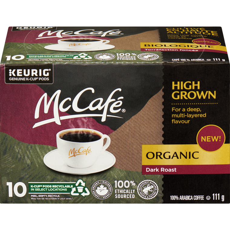 McCafé® High Grown Organic Dark Roast Coffee is made from 100% Arabica beans grown at high elevations in Central and South America’s coffee regions. At these heights, beans can develop more density, resulting in layers of deep, rich, full-bodied flavour with subtle notes of cocoa and caramel.