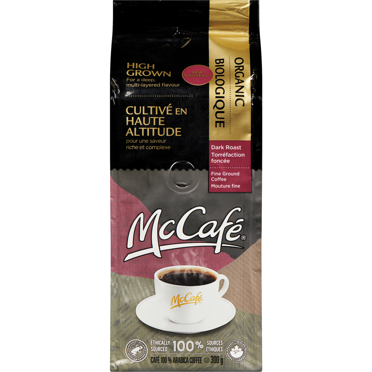 McCafé® High Grown Organic Dark Roast Coffee is made from 100% Arabica beans grown at high elevations in Central and South America’s coffee regions. At these heights, beans can develop more density, resulting in layers of deep, rich, full-bodied flavour with subtle notes of cocoa and caramel.