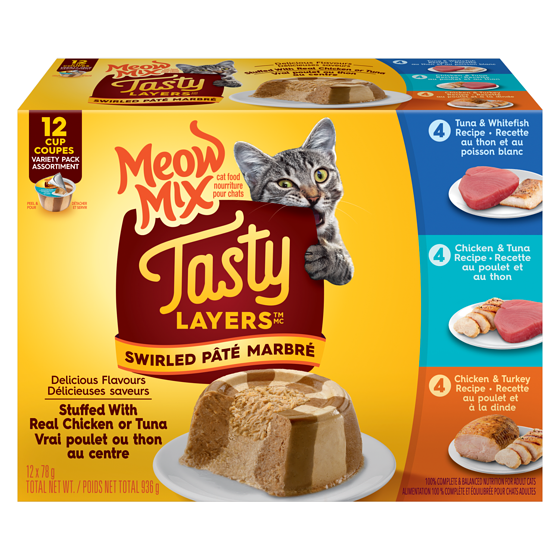 Delicious flavours. . Stuffed with real chicken or tuna. . Swirled pâté. . 100% complete & balanced nutrition for adult cats. . Irresistible layers of flavour your cat will love. . Meow Mix Tasty Layers™ is a l
