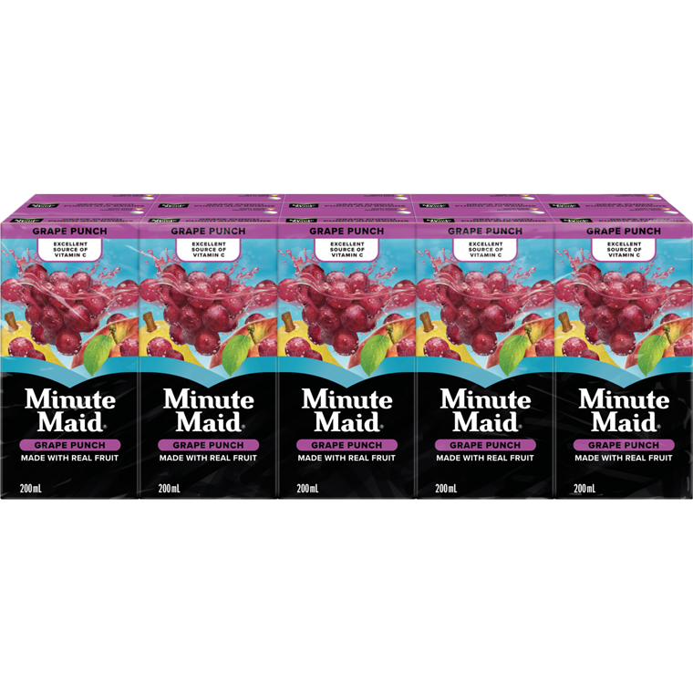 Mix things up with this refreshing combination of playful fruit flavours that come together in a delicious grape blend. Made with real fruit, it’s an excellent source of Vitamin C. As a global leader in juice beverages, we’re on a mission to source high quality fruit and to deliver you and your family goodness. With generations of fruit expertise, Minute Maid® is a well-loved brand with a 60+ year history of delivering great-tasting and trustworthy products. Feel good about giving yourself and your family Minute Maid®. Enjoy a refreshingly juicy fruit drink with Minute Maid Grape PunchGrape punch drink made with real fruit.Contains 100% natural flavoursEvery yummy sip starts with good fruit from good farmsBring goodness to your family in every 200 mL carton, 10 pack