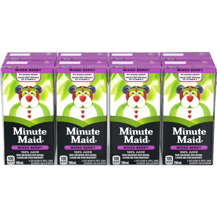 Enjoy a taste explosion featuring a blend of apple, grape, raspberry and blackberry juices. With 100% juice and no sugar added, it’s an excellent source of Vitamin C in a juice box format. As a global leader in juice beverages, we’re on a mission to source high quality fruit and to deliver you and your family goodness. With generations of fruit expertise, Minute Maid® is a well-loved brand with a 60+ year history of delivering great-tasting and trustworthy products. Feel good about giving yourself and your family Minute Maid®. Nourish with Minute Maid Mixed Berry Juice beverage, a good source of vitamin CThis 100% mixed berry juice from concentrate refreshes with a sweet berry tasteBlends the ripe fruit flavours of apple, grape, raspberry and blackberry in every sip, and is never sweetenedBringing goodness to your family for 75 years200 mL carton 8pk