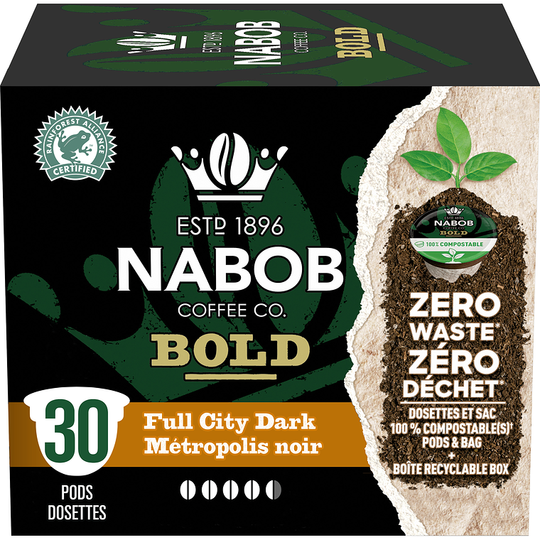 Nabob Bold Full City Dark Coffee has an authentic rich and dark roast. Ever since our beginnings back in 1896, we at the Nabob Coffee Co. continue to fuel our passion for coffee, our communities and the environment. This Nabob Bold blend cannot contain its smoky, full-bodied flavour that is velvety smooth. All you need are your finely tuned taste buds to enjoy it to the fullest.One 292G box of Nabob Bold Full City Dark Coffee Single Serve Pods (30 pods)Made with 100% Arabica beansNabob Coffee is Rainforest CertifiedZero Waste - pods are compostable and packaging is recyclable