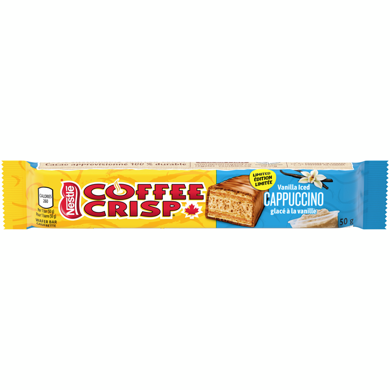 The Canadian beverage of the summer is now available in a COFFEE CRISP! For a limited time only, enjoy a COFFEE CRISP Vanilla Iced Cappuccino Wafer Bar (50 g). This delicious Canadian treat has been a favourite since 1939 and is prepared at the Sterling Road factory in Toronto.