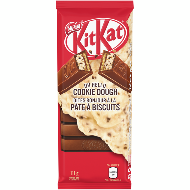 Say 'Oh Hello' to Cookie Dough. NESTLÉ KITKAT Cookie Dough Wafer Bar (111 g) combines the classic KITKAT crispy wafer with a mouth-watering Chocolate Chip Cookie Dough filling for a treat that will make any break one to remember. With 9 rows of KITKAT wafers, you can take it slow and eat them one at a time or share with up to 8 friends or family. This KITKAT bar is made with 100% sustainably sourced cocoa certified by Rainforest Alliance and all natural flavours, so you can feel good about eating something that tastes this good. HAVE A BREAK, HAVE A KITKAT!