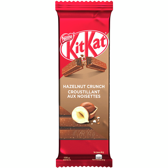 Break off a piece of the new NESTLÉ KITKAT Hazelnut Crunch Wafer Bar (120 g). Inside each bar is a shareable treat with 10 rows of irresistible, rich and crunchy hazelnut pieces on a classically crisp KITKAT wafer, enrobed in a smooth milk chocolatey coating. A chocolate lover’s delight, this decadent combination is the perfect, special addition to your well-deserved break. HAVE A BREAK, HAVE A KITKAT.Hazelnut pieces on a classically crisp KITKAT wafer, covered in a milk chocolatey coating.100% Sustainably Sourced Cocoa certified by UTZ, as part of the NESTLÉ COCOA PLAN10 rows of irresistible KITKAT wafers, perfect for adding a little something special to your break210 calories per 4 pieces (40 g)HAVE A BREAK, HAVE A KITKAT