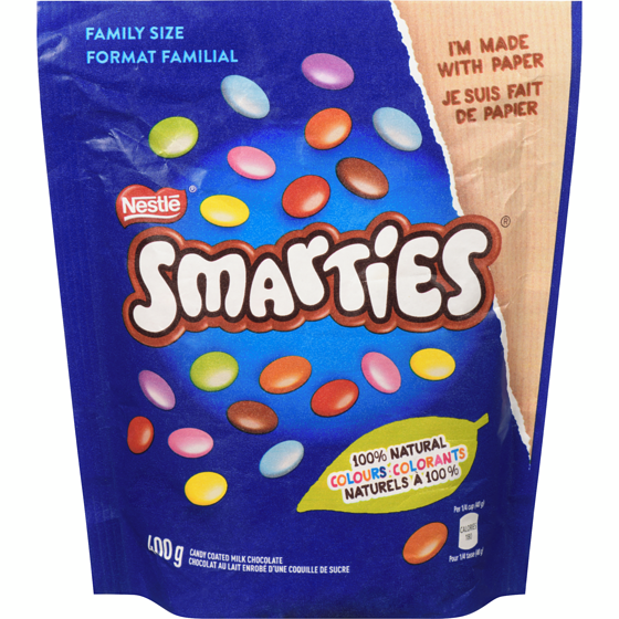 Enjoy your favourite Canadian candy pieces now, later, and wherever you like! NESTLÉ SMARTIES Candy Coated Milk Chocolate Resealable Pouch (400 g) is a share-sized bag full of the classic, irresistible milk chocolate pieces with the crunch of colourful candy shells. The resealable pouch makes it easy to share, seal, and take on-the-go – perfect for putting out for guests at your next party, mixing into your own baking creations, or taking with you on a family trip. Not only are they as vibrant as ever, each piece is made with no artificial colours and natural flavours. It’s just simply the best way to portion out your SMARTIES. The only question is, Do you eat the red ones last?A share-sized, resealable pouch full of milk chocolate pieces covered in a colourful candy shellMade with no artificial colours and natural flavours, and made in a peanut-free facilityThe resealable pouch makes it a snap to portion, share, and save for later – perfect for family trips and entertaining guestsWe purchase 100% Sustainably Sourced Cocoa certified by UTZ, as part of the NESTLÉ COCOA PLAN. We work with UTZ and farmers to improve the quality of their products and strengthen their communitiesProudly prepared at our Sterling Road factory, right here in Canada!We proudly support Kids Help Phone! NESTLÉ has raised more than $10.2 million in support of Kids Help Phone over the last 28 yearsDo you eat the red ones last?