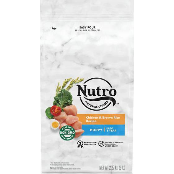 NUTRO NATURAL CHOICE Puppy Chicken & Brown Rice Recipe Dog Food always starts with chicken as the first ingredient. NUTRO Food for Dogs follows the THE NUTRO FEED CLEAN philosophy, and is always made with Non-GMO† Ingredients and no artificial flavours, colours or preservatives. Our bags have a CLEAN NEW LOOK! †Trace amounts of genetically modified material may be present due to potential cross contact during manufacturing.Contains one (1) 2.27 kg bag of Nutro Puppy Chicken & Brown Rice RecipeChicken is the #1 IngredientWith Non-GMO ingredientsNo Artificial flavours