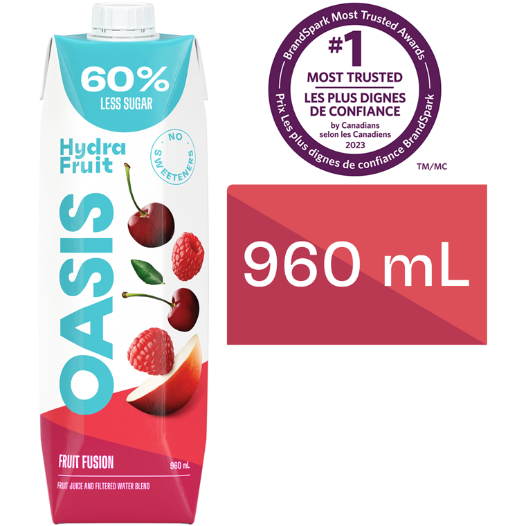 Enjoy a burst of juicy fruit flavour with Oasis Hydrafruit Fruit Fusion Fruit Juice. Made with delicious apple, cherry and raspberry juices and filtered water, this low-sugar drink is the perfect refreshment for every joyful moment. Oasis Hydrafruit contains 60 percent less sugar than the leading regular fruit blends, making this an excellent choice for refreshment without compromise. It is also low in calories and contains an excellent source of vitamin C. With natural colours and flavours, your whole family will want to hydrate with Oasis Hydrafruit.Thank you for voting Oasis as the Most Trusted Fruit Juice in Canada.*Refrigerate after opening and consume within 10 days.Shake well before opening. Serve chilled.Voted #1 Most Trusted Fruit Juice in Canada*A blend of fruit juices and filtered waterContains 60% less sugar than the leading regular fruit blendsNo sweetenersExcellent source of vitamin CNatural flavours and coloursRecyclable packagingPrepared in Canada* Voted most trusted Fruit Juice brand by Canadian shoppers based on the 2023 BrandSpark® Canadian Trust Study.