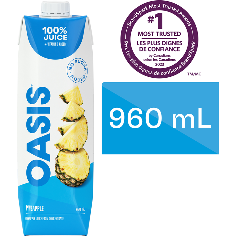 Dreaming of your next vacation? One sip of Oasis Pineapple Juice and you can imagine yourself sitting on a sun-kissed beach somewhere in the world. This fruit juice is made with 100% pure pineapple juice from concentrate and is an excellent source of vitamin C. This pineapple juice contains no added sugar and contains only natural flavours and colours. Pineapple juice is a delicious way to quench your thirst and find your Oasis - in your backyard or in your dreams. For every moment of joy, there's Oasis.Thank you for voting Oasis as the Most Trusted Fruit Juice in Canada.*Keep refrigerated. Preferably consume within 10 days of opening.Shake well before opening.Voted #1 Most Trusted Fruit Juice in Canada*100% pure juiceNo sugar addedExcellent source of vitamin CNatural flavours and coloursNo preservativesPasteurizedRecyclable packagingPrepared in Canada* Voted most trusted Fruit Juice brand by Canadian shoppers based on the 2023 BrandSpark® Canadian Trust Study.