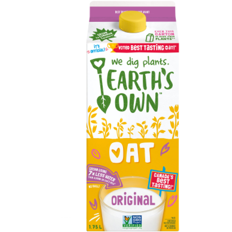 Voted as being the Best Tasting Oat Milk in a Canada-wide taste challenge, our Oat Original brings rich, delicious flavour to your day. It froths great for your hot coffee or iced lattes and tastes delicious poured into your favourite cereal. Or, blend it to make a creamy smoothie for on the go. It's a great base for your plant-based overnight oats too! You can also use it as a dairy replacement for your favourite meals or baked goods. Earth's Own Original Oat Milk is made with Canadian-grown oats and uses 7x less water than cow's milk. NBD. Wait, that is a BD!