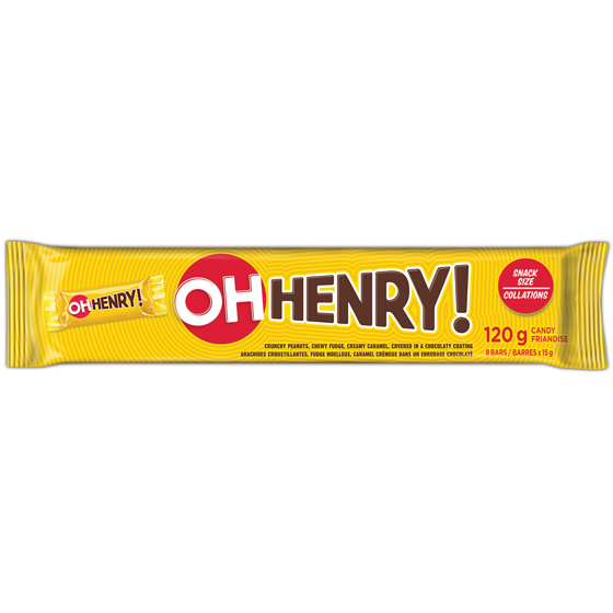 OH HENRY! candy bar is made with big crunchy peanuts, creamy caramel, chewy fudge, covered with a chocolaty coating. Its delicious combination of ingredients feeds all your senses and satisfies your appetite to help keep you going. Keep this 8 pack of snack sized bars close for snacking or sharing. One 120g package (8 pack) of OH HENRY! Snack Sized Candy Bars. Crunchy peanuts, chewy fudge, creamy caramel, covered in a chocolatey coating. OH HUNGRY? OH HENRY! Feed your hunger with the delicious taste and chewy and crunchy textures. Each bar is individually wrapped for freshness and convenience. Perfect to enjoy at home, on-the-go, at the office, sporting events, or anywhere that deserves a sweet treat. Perfect for sharing- stock up now!