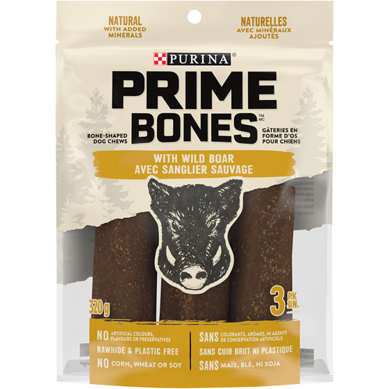 Satisfy your dog's instinctual love of chewing with Purina Prime Bones Dog Chews With Real Wild Boar. These extra-long-lasting, natural dog chews with added calcium are rawhide free and provide a safe and naturally edible treat that your dog is sure to love. Each of these limited ingredient dog treats provides extra-long-lasting enjoyment with a chewy, bone-shaped exterior and a soft, meaty centre to keep him entertained and thinking about his next big adventure in the wild. Give him big, untamed flavour, in a natural dog treat that helps clean his teeth, too. Plastic & rawhide freeFilled bones made with real wild boarNatural dog treats with added mineralsLong lasting dog chews help clean teeth and freshen breathIndulgent, soft, meaty centre for tantalizing taste