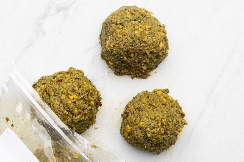 Ingredients: Chickpeas, Onion, Parsley, Cilantro, Cumin, Coriander, Tomato paste, Chili, Baking soda.