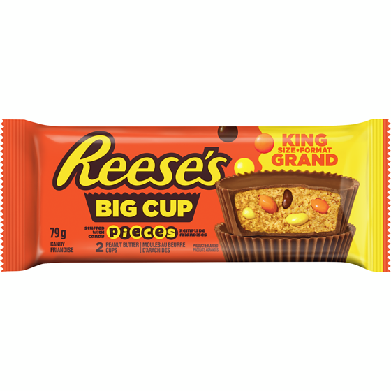 REESE PEANUT BUTTER CUPS candy and REESE’S PIECES candy have come together to create the ultimate in peanut butter cups: REESE PEANUT BUTTER CUPS big cup candy stuffed with REESE'S PIECES candy.