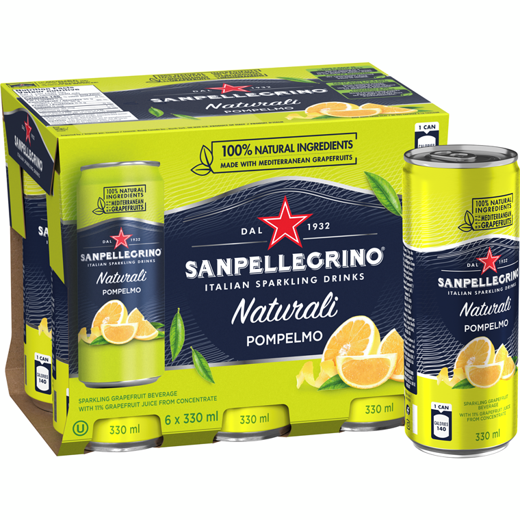 SAN PELLEGRINO Naturali is the carefully crafted mix of real Italian fruit juices, 100% natural ingredients and sparkling bubbles that turns any time into a delightful moment. SAN PELLEGRINO Naturali Pompelmo is made with sun-ripened grapefruit from the citrus groves of the Mediterranean and lingers with softness youβll never forget. The 330 mL can format is ideal for on-the-go refreshment.SAN PELLEGRINO is strongly committed to safeguarding the Earthβs precious gifts and is dedicated to protecting the source of taste by looking after the territories, managing resources sustainably and respecting the environment by becoming 100% carbon neutral by 2022. Today, SAN PELLEGRINO Naturali 330 mL cans are 100% recyclable and are made with 25% recycled aluminum. Mix of real Italian fruit juices, 100% natural ingredients and sparkling bubbles330 mL cans and outer pack carton are 100% recyclableNo artificial sweeteners or coloursIntense bouquet of tasty zest and squeezed lemon juicePerfect for a tasty break