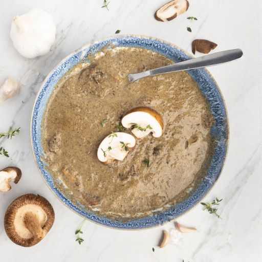 Ingredients: Mushrooms, Onions, Garlic, Thyme, Porcini powder, Bay leaves, Cream, Butter.