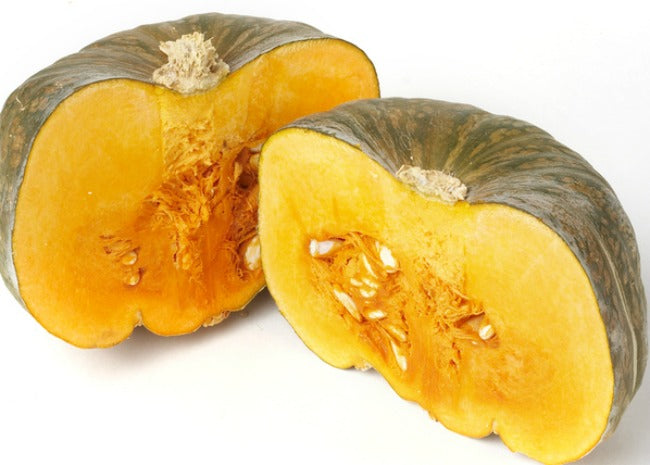 The thick flesh is spongy, dense, and a deep yellow-orange with a central cavity filled with stringy pulp and many flat, cream-colored seeds. When cooked, Kabocha squash has a finely grained, dry, tender texture with a buttery, sweet, and rich, nutty flavor reminiscent of sweet potato and pumpkin.