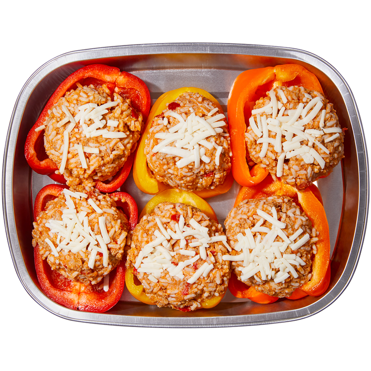 A homestyle favourite! Fresh sweet peppers hand-stuffed with a hearty mix of rice, Canadian ground beef, mozzarella cheese, pepper and chunky tomato sauce and topped with even more shredded cheese. Ready-to-bake for a quick and healthy weeknight dinner. Serves 6