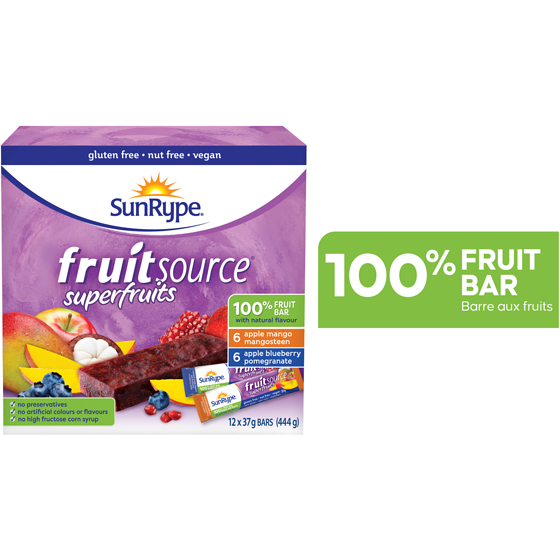 Featuring a delicious blend of fruit flavours, this SunRype Fruitsource 100% Fruit Bar Pack includes six Apple Mango Mangosteen bars and six Apple Blueberry Pomegranate bars. Each 37 gram bar is vegan, gluten-free, nut-free and made with no artificial colours, flavours or preservatives. Try these delicious and nutritious fruit bars in a packed lunch or keep them in your car for whenever you need a quick and convenient snack. 100% Fruit barSource of fibreSource of potassiumGluten-freeNut-freeVeganNo preservativesNo artificial flavours or coloursNo high fructose corn syrupKosher12 x 37 g