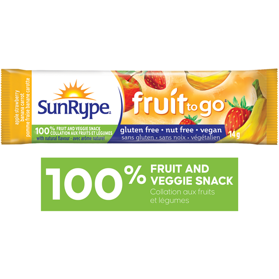 SunRype Fruit to Go Apple Strawberry Banana Carrot 100% Fruit and Veggie Snacks are vegan, gluten-free, nut-free and made with no preservatives, artificial colours or flavours. Made from 100% fruit and veggies, these wholesome fruit snacks are a delicious, nutritious choice you can always feel good about. They're convenient on-the-go options for packed lunches, after-school snacks, road trips and more.100% Fruit and veggie snackGluten-freeNut-freeVeganNo preservativesNo artificial flavours or coloursNo high fructose corn syrupKosher14 g