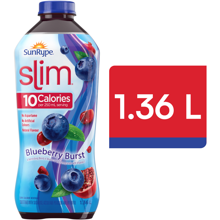 Full of flavour with only 1g of sugar and 10 calories per 250mL serving, SunRype Slim Blueberry Burst is the perfect low-calorie fruit beverage to quench your thirst. This refreshing fruit beverage is made with natural flavours and no aspartame or artificial colours. This flavour packed fruit beverage will have you saying βMmmmmmβ after every sip.1g sugar per 250mL serving10 calories per 250mL servingLow caloriesNo aspartameNo artificial coloursNatural flavourProudly Canadian brand
