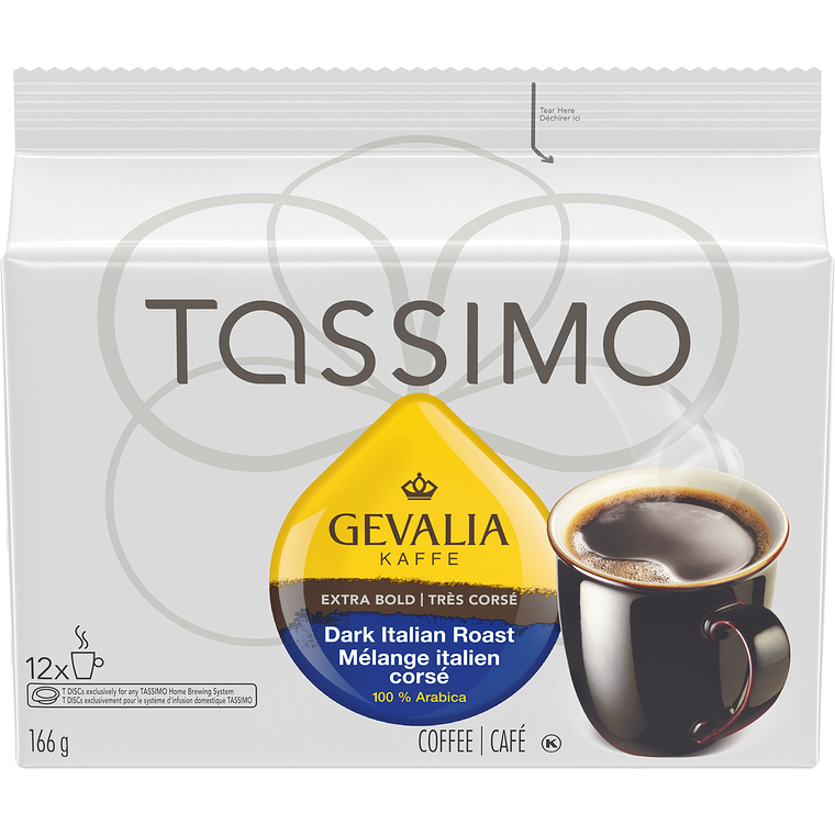 Tassimo Gevalia Dark Italian Roast Coffee T-Discs make a perfectly bold cup of Gevalia's Dark Italian Roast every time. A dark roast, full-bodied selection made with an extra bold taste that is both sharp and intense. Made with 100% Arabica beans of the highest quality, this complex and hearty blend is reminiscent of the finest cafΓ©s in Italy. Experience the premium dark roasts of Gevalie Kaffe. Originating in Sweden in 1853, this majestic coffee brand was enjoyed by Swedish royalty. Today, Gevalia beans are still carefully selected and slowly roasted so you can enjoy Gevalia dark roast coffee like royalty. Tassimo Gevalia Dark Italian Roast Coffee T-Discs are compatible with any Tassimo brewing system.One 166G bag of Tassimo Gevalia Dark Italian Roast Coffee T-Discs (12 t-discs)Each T-Disc makes one 8 fl oz/236 ml cup of coffeeExtra bold roast coffeeT-Discs are compatible with Tassimo brewersKosher Certified