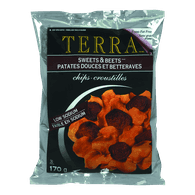 TERRA Chips are traditionally a delicious variety of cherished root vegetables cooked to a light tasting perfection. In our TERRA Sweets & Beets we combined the delectable taste of sweet potatoes with another sweet delight made from the Earth's own vegetables - vibrant, mouth- watering beets. These Sweets & Beets offer bold colour and flavour with a hearty crunch that will create a memorable experience each time you open a new bag..SWEET POTATO.A distinct variety of the Ipomoea batatas, these potatoes deliver a glorious late summer orange..BEET.A biennial root vegetable, delivers natural sweetness and a vibrant red colour. Generally a cool season crop which we cook to perfection.