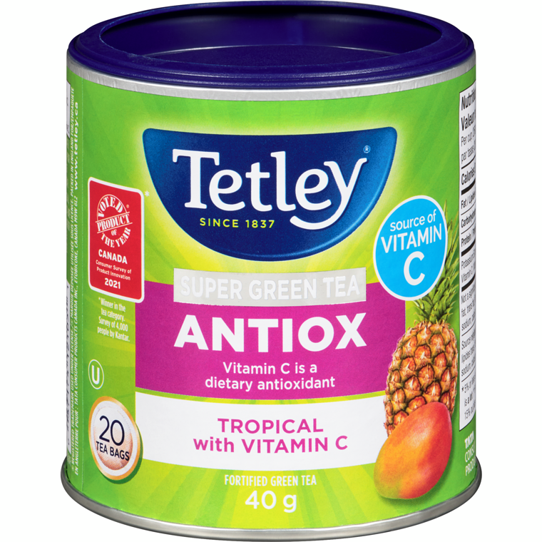 Tetley Super Green Antiox tea is a source of Vitamin C, which is known to have a myriad of health benefits. According to Health Canada, Vitamin C helps the body absorb iron, heal wounds and acts as an antioxidant. Each cup of Tetley Antiox Tea contains 25% of an adult’s recommended daily intake of Vitamin C. Vitamin C is a dietary antioxidant and protects against the damage of free radicals.