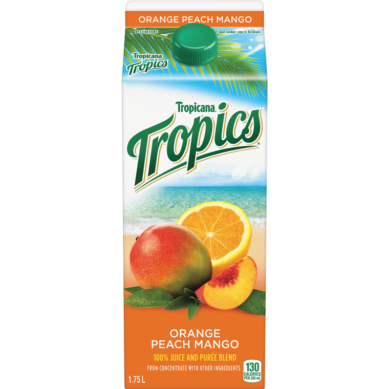 Try our tropical trio of delicious fruit! Tropicana Tropics Orange Peach Mango 100% juice and puree blend will remind you of the relaxing pleasures of an escape to the islands.