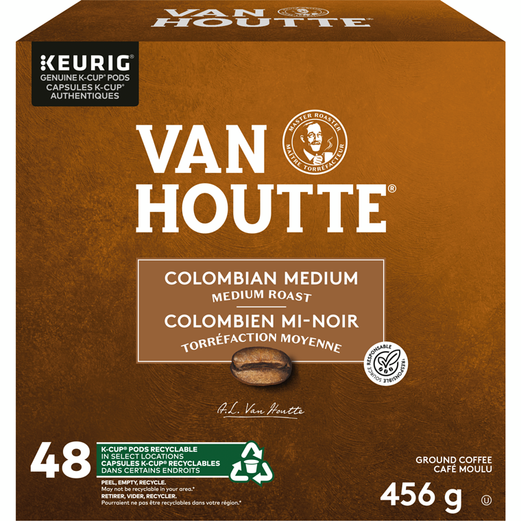 Keurig®Genuine K-Cup® podsMaster roasterVan Houtte®Responsible source††Our coffee is grown to create a positive, lasting impact for farmers and the environment, so it can be enjoyed for generations.A.L. Van HoutteMaster roasterSince 1919®A true Colombian-style coffee featuring a smooth yet lively flavour with subtle hints of fruity wine.Slow roasting in single batchesEuropean craftsmanshipApproved by our master roasterCommitted to 100% responsibly sourced coffeewww.keurig.ca/responsiblecoffee